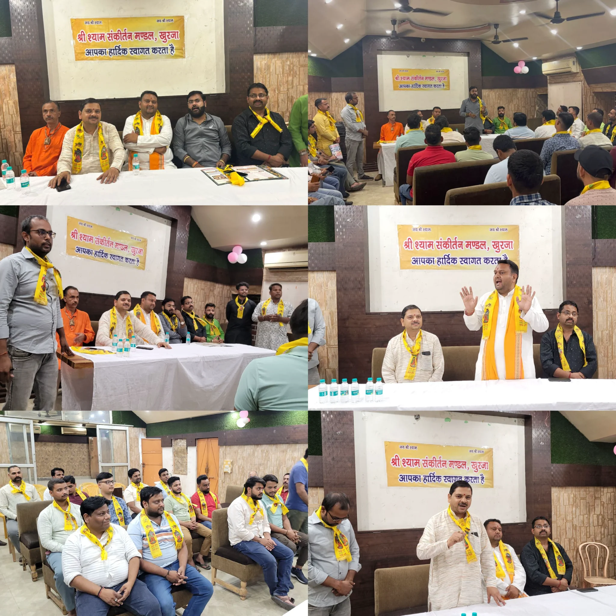 श्री श्याम संकीर्तन मंडल द्वारा नगर में निकलेगी भव्य चतुर्थ निशान यात्रा, बैठक में किया गया विचार विमर्श खुर्जा/बुलन्दशहर/उत्तर प्रदेश: श्री श्याम संकीर्तन मंडल के तत्वावधान में नगर में भव्य चतुर्थ निशान यात्रा निकाली जाने की व्यवस्थाओं की तैयारियों हेतु एक बैठक रविवार देरशाम ओम फैमिली रेस्टोरेंट में संपन्न हुई। बैठक